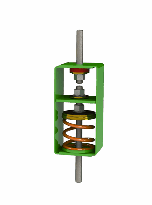 Vibro Acoustics Prepositioning Spring Hangers (SHRP) series provides vibration isolation for suspended equipment. The SHRP spring hangers Featuring an integrated pre-positioning plate, these hangers maintain fixed elevation during installation — eliminating the need for temporary rigid hangers and simplifying the process for safer, faster setup. The galvanized housing allows for reasonable angular misalignment from vertical before the support rod contacts the housing. Our uniquely-engineered springs are powder- coated to endure a variety of environments, and other hardware shown is zinc-plated. The SHRP series includes the addition of a neoprene element for isolation of high frequency vibration.